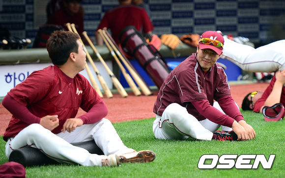 12일 부산 사직구장에서 열리는 '2013 한국야쿠르트 세븐 프로야구' 롯데 자이언츠와 넥센 히어로즈의 경기전 넥센 김병현이 허도환과 이야기를 나누며 스트래칭을 하고 있다.