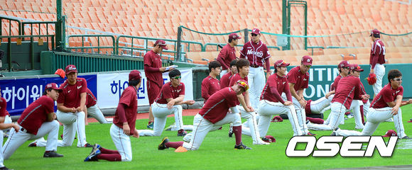 12일 부산 사직구장에서 열리는 '2013 한국야쿠르트 세븐 프로야구' 롯데 자이언츠와 넥센 히어로즈의 경기전 넥센 선수들이 스트래칭을 하고 있다.