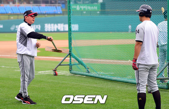 김기태 감독,'정의윤! 방망이 균형 잡기에는 밀대가 최고야'