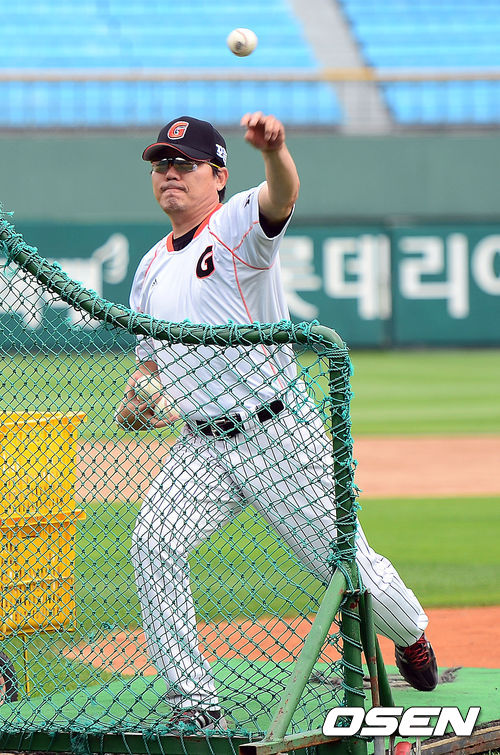 12일 부산 사직구장에서 열리는 '2013 한국야쿠르트 세븐 프로야구' 롯데 자이언츠와 넥센 히어로즈의 경기전 롯데 김응국 코치가 배팅볼을 던지고 있다.