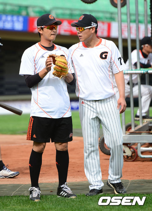 12일 부산 사직구장에서 열리는 '2013 한국야쿠르트 세븐 프로야구' 롯데 자이언츠와 넥센 히어로즈의 경기전 롯데 최기문 코치가 1군에 복귀한 박기혁과 이야기를 나누고 있다.