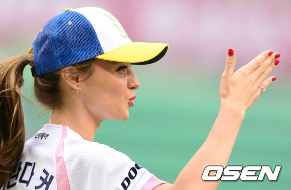 한편 이날 세계적인 모델이자 할리우드 배우 올랜드 블룸의 아내로도 유명한 미란다 커가 두산의 퀸스데이 핑크 유니폼을 입고 시구를 해 눈길을 끌었다./ jpnews@osen.co.kr