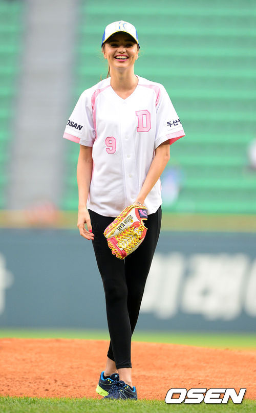한편 이날 세계적인 모델이자 할리우드 배우 올랜드 블룸의 아내로도 유명한 미란다 커가 두산의 퀸스데이 핑크 유니폼을 입고 시구를 해 눈길을 끌었다./ jpnews@osen.co.kr