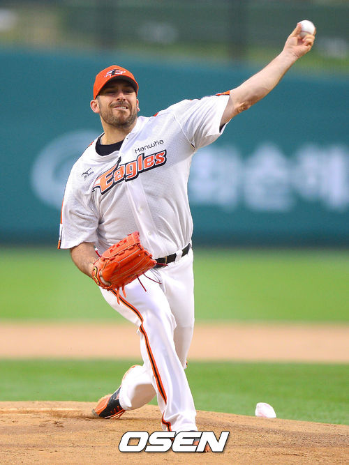 13일 오후 대전구장에서 열린 '2013 한국야쿠르트 세븐 프로야구' 한화 이글스와 LG 트윈스의 경기, 1회초 한화 선발투수 이브랜드가 역투하고 있다