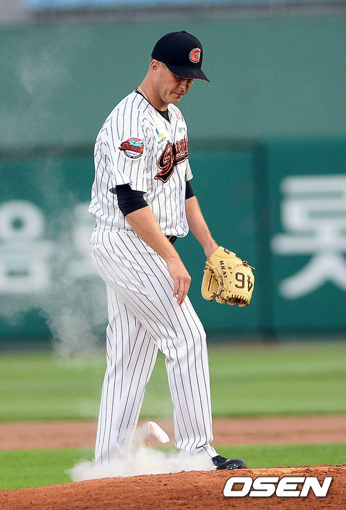 12일 부산 사직구장에서 열린 '2013 한국야쿠르트 세븐 프로야구' 롯데 자이언츠와 넥센 히어로즈의 경기, 1회초 1사 2,3루 롯데 옥스프링이 볼넷과 안타로 실점위기에 몰려있자 로진백을 바닥으로 던지고 있다.
