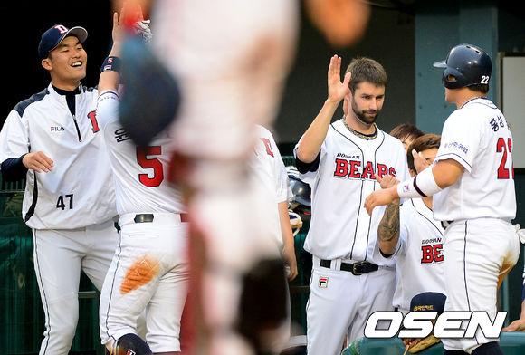 13일 오후 서울 잠실야구장에서 열린 '2013 한국야쿠르트 세븐 프로야구' 두산 베어스와 SK 와이번스의 경기, 2회말 2사 2,3루에서 두산 최재훈의 역전 2타점 좌전 적시타에 홈을 밟은 윤석민, 홍성흔이 더그아웃에서 동료선수들과 하이파이브를 하고 있다.