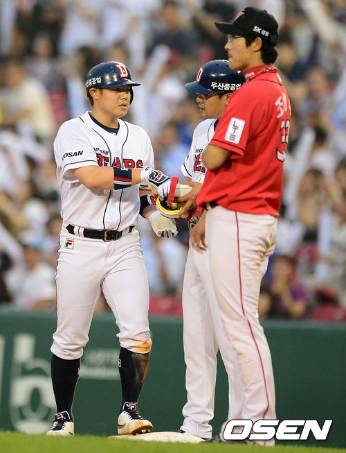 13일 오후 서울 잠실야구장에서 열린 '2013 한국야쿠르트 세븐 프로야구' 두산 베어스와 SK 와이번스의 경기, 3회말 2사 1,2루에서 두산 윤석민이 1타점 적시타를 날리고 김민재 코치와 이야기를 나누고 있다.