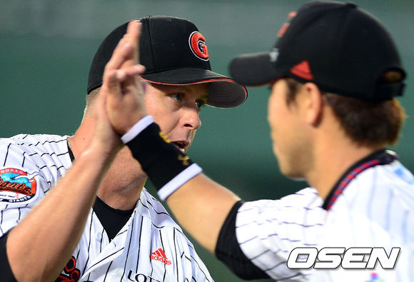 12일 부산 사직구장에서 열린 '2013 한국야쿠르트 세븐 프로야구' 롯데 자이언츠와 넥센 히어로즈의 경기, 롯데 옥스프링이 4회초 공격을 무실점으로 막아낸 뒤 야수들과 하이파이브를 하고 있다.