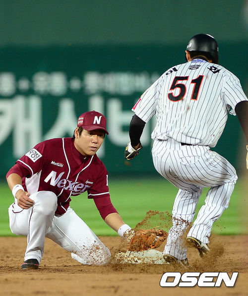 12일 부산 사직구장에서 열린 '2013 한국야쿠르트 세븐 프로야구' 롯데 자이언츠와 넥센 히어로즈의 경기, 4회말 1사 루 넥센 강정호가 2루 도루를 시도하는 롯데 이승화를 잡아내고 있다.