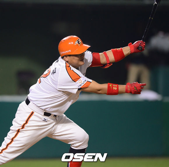 13일 오후 대전구장에서 열린 '2013 한국야쿠르트 세븐 프로야구' 한화 이글스와 LG 트윈스의 경기, 5회말 2사 1루 한화 김태균이 안타를 날리고 있다.