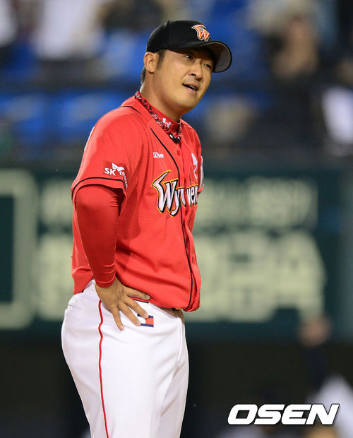 13일 오후 서울 잠실야구장에서 열린 '2013 한국야쿠르트 세븐 프로야구' 두산 베어스와 SK 와이번스의 경기, 5회말 무사 1,3루에서 SK 임경완이 두산 홍성흔의 투수앞 땅볼에 홈에 악송구로 득점을 허용하고 아쉬워하고 있다.