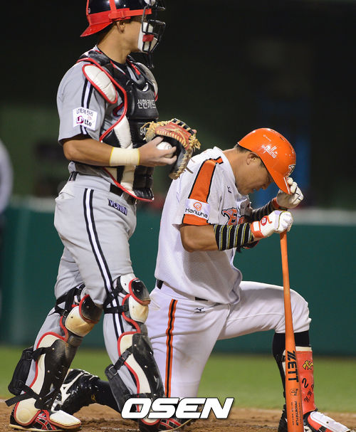 13일 오후 대전구장에서 열린 '2013 한국야쿠르트 세븐 프로야구' 한화 이글스와 LG 트윈스의 경기, 6회말 1사 2,3루 한화 박노민이 삼진아웃 당한뒤 무릎을 꿇어 앉아있다.