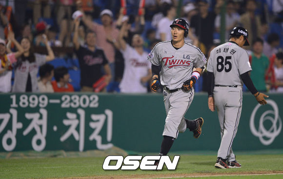 13일 오후 대전구장에서 열리는 '2013 한국야쿠르트 세븐 프로야구' 한화 이글스와 LG 트윈스의 경기, 7회초 2사 LG 손주인이 솔로홈런을 날리고 최태원 코치와 하이파이브를 하고 있다.