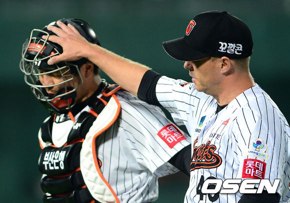12일 부산 사직구장에서 열린 '2013 한국야쿠르트 세븐 프로야구' 롯데 자이언츠와 넥센 히어로즈의 경기, 롯데 옥스프링이 7회초를 무실점으로 막아낸 뒤 더그아웃으로 들어오면서 강민호와 이야기를 나누고 있다.