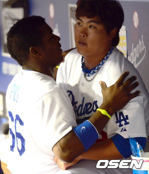 5회말 3루타를 치고 득점까지 올린 류현진을 푸이그가 반갑게 맞이하고 있다./ baik@osen.co.kr