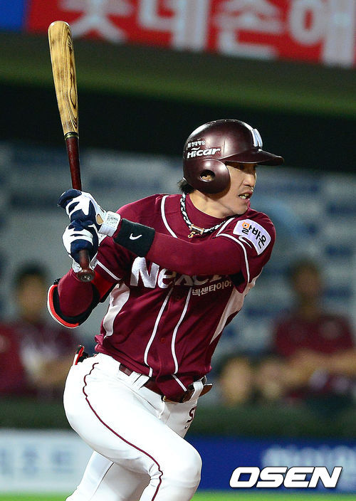 12일 부산 사직구장에서 열린 '2013 한국야쿠르트 세븐 프로야구' 롯데 자이언츠와 넥센 히어로즈의 경기, 8회초 무사 1,3루 넥센 장기영이 1타점 적시타를 때리고 있다.