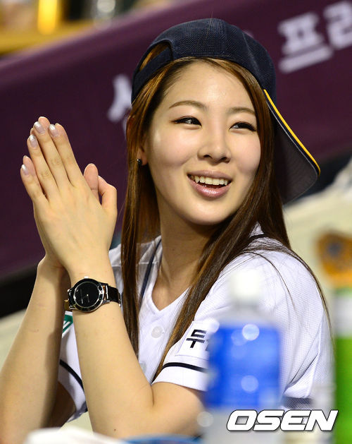 13일 오후 서울 잠실야구장에서 열린 '2013 한국야쿠르트 세븐 프로야구' 두산 베어스와 SK 와이번스의 경기, 신수지 전 체조선수가 야구장을 찾아 경기를 관전하고 있다.