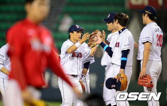 경기후 두산이 승리 하이파이브를 하고 있다./ jpnews@osen.co.kr