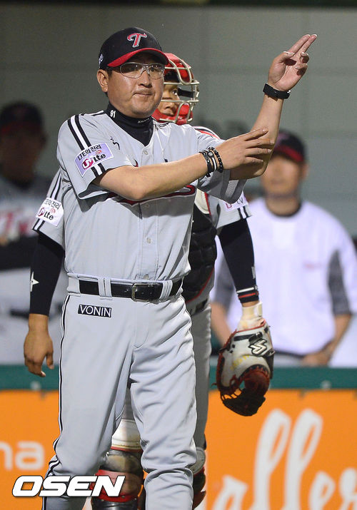 SEN=대전,박준형 기자] 13일 오후 대전구장에서 열리는 '2013 한국야쿠르트 세븐 프로야구' 한화 이글스와 LG 트윈스의 경기,9회말 무사 만루위기에서 LG 김기태 김기태 감독이 임정우 투수 교체 사인을 보내고 있다.