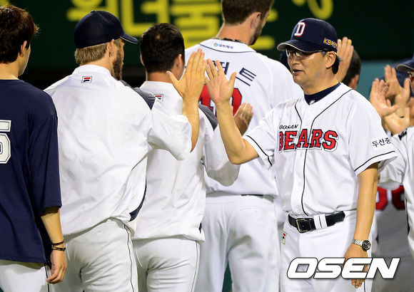 경기후 김진욱 감독이 올슨과 하이파이브를 하고 있다./ jpnews@osen.co.kr