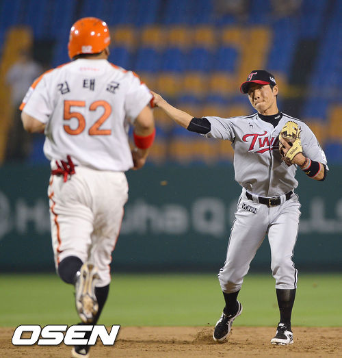 9회말 1사 1,2루 한화 고동진의 내야땅볼때 LG 권용관 유격수가 1루 주자 김태균을 포스아웃 시키고 병살시도하고 있다. / soul1014@osen.co.kr