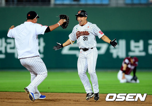 11회 말 2사 1,2루 롯데 손아섭이 끝내기 안타를 때린 뒤 송승준과 기뻐하고 있다. / youngrae@osen.co.kr