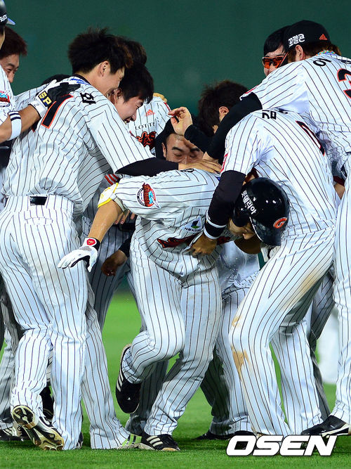 11회 말 2사 1,2루 롯데 손아섭이 끝내기 안타를 때린 뒤 동료들에게 축하받고 있다. / youngrae@osen.co.kr