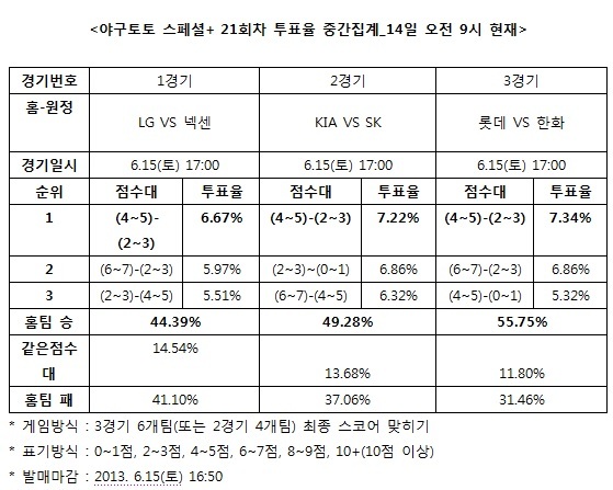 1경기 LG-넥센전에서는 LG(44.39%)와 넥센(41.10%)의 투표율이 거의 비슷하게 집계돼 승부를 알 수 없는 치열한 박빙승부를 예고했다. 한편 이번 야구토토 스페셜+ 21회차 게임은 15일 오후 4시 50분에 발매가 마감된다.