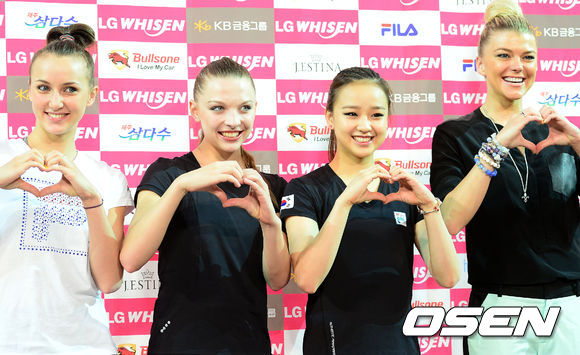 우크라이나 안나 리자트디노바, 벨라루스 스타니우타 멜리티나, 손연재, 이리샤 블로히나 안무 총감독이 포토타임을 하고 있다.