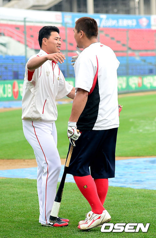 14일 오후 광주 무등구장에서 열리는 2013 한국야쿠르트 세븐프로야구 KIA 타이거즈와 SK 와이번스의 경기전 SK 김상현과 KIA 최희섭이 포옹을 하고 있다.