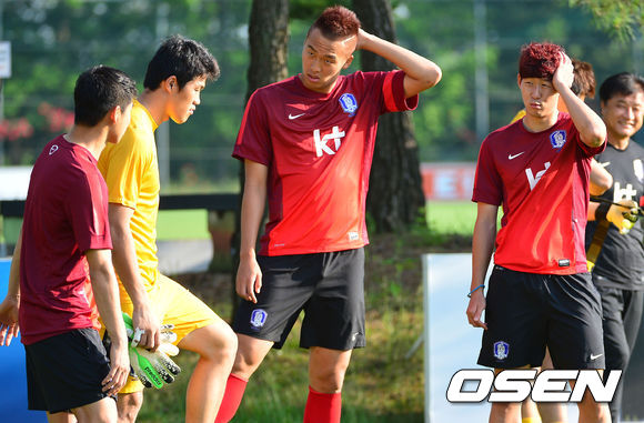 오는 18일 이란과의 월드컵 최종예선전을 앞둔 최강희호가 14일 오후 파주NFC에서 훈련을 가졌다. 독일 레버쿠젠으로 이적한 손흥민과 김신욱, 이근호, 정성룡이 대화를 나누고 있다.