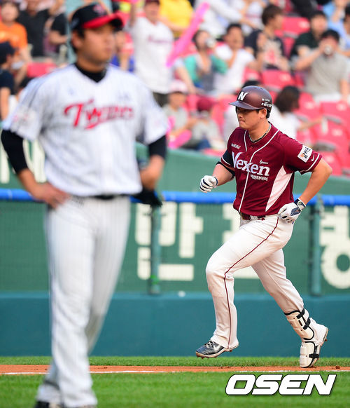 14일 오후 서울 잠실구장에서 열린 2013 한국야쿠르트 세븐프로야구 LG 트윈스와 넥센 히어로즈 경기, 2회초 1사 주자 1루 넥센 이성열이 좌중월 선취 투런홈런을 날린 후 그라운드를 돌고 있다.
