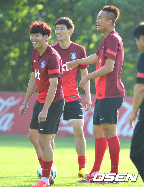 오는 18일 이란과의 월드컵 최종예선전을 앞둔 최강희호가 14일 오후 파주NFC에서 훈련을 가졌다. 독일 레버쿠젠으로 이적한 손흥민과 지동원, 김신욱이 훈련 중 미소짓고 있다.