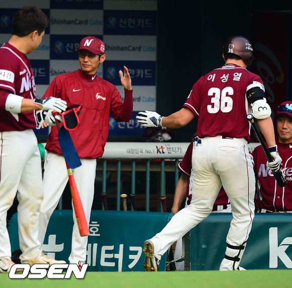 14일 오후 서울 잠실구장에서 열린 2013 한국야쿠르트 세븐프로야구 LG 트윈스와 넥센 히어로즈 경기, 2회초 1사 주자 1루 넥센 이성열이 좌중월 선취 투런홈런을 날린 후 덕아웃에서 염경엽 감독과 하이파이브를 하고 있다.