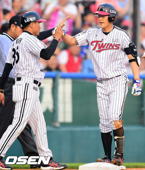 14일 오후 서울 잠실구장에서 열린 2013 한국야쿠르트 세븐프로야구 LG 트윈스와 넥센 히어로즈 경기, 2회말 2사 주자 2루 LG 문선재가 1타점 3루타를 날린 후 3루에서 최태원 코치와 하이파이브를 하고 있다.