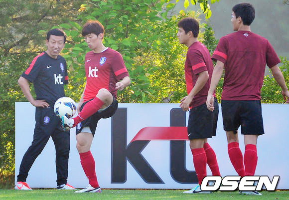 오는 18일 이란과의 월드컵 최종예선전을 앞둔 최강희호가 14일 오후 파주NFC에서 훈련을 가졌다. 최강희 A대표팀 감독이 선수들의 훈련을 지켜보며 미소짓고 있다.