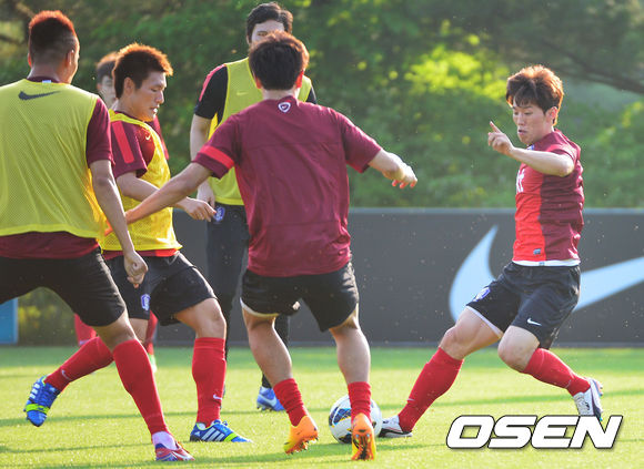 오는 18일 이란과의 월드컵 최종예선전을 앞둔 최강희호가 14일 오후 파주NFC에서 훈련을 가졌다. A대표팀 김보경과 이명주를 비롯한 선수들이 미니게임 훈련을 진행하고 있다.