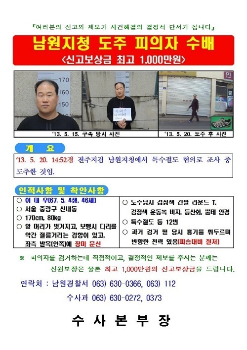 약 한 달여간 경찰의 검거망을 뚫고 도피행각을 벌인 전과 12범 이대우는 작년 4월부터 최근까지 교도소 동기와 함께 제주도를 제외한 전국을 돌며 150차례에 걸쳐 6억 7000만 원 어치의 금품을 훔친 혐의를 받은 전문 절도범으로, 그 동안 수갑을 찬 채 달아난 뒤 계속 검거되지 않아 '제2의 신창원'으로 불렸다.