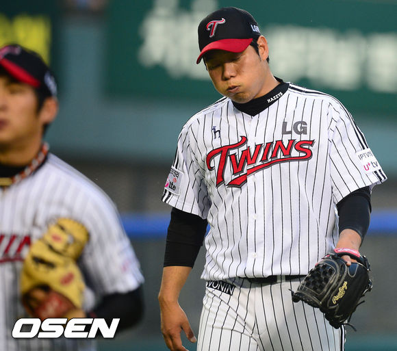 14일 오후 서울 잠실구장에서 열린 2013 한국야쿠르트 세븐프로야구 LG 트윈스와 넥센 히어로즈 경기, 4회초를 마친 LG 선발 류제국이 큰 숨을 내쉬며 덕아웃으로 들어오고 있다.