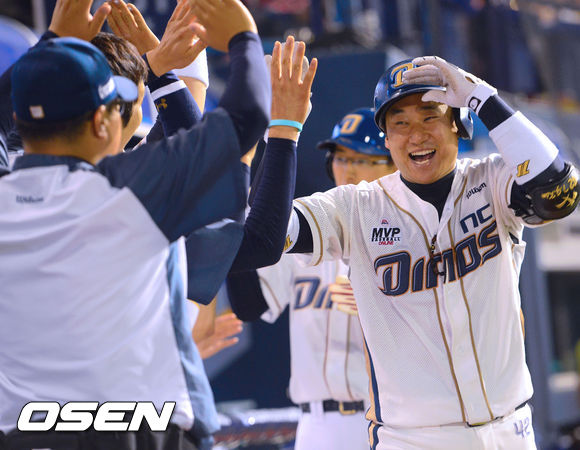 14일 오후 경남 창원시 마산구장에서 열린 2013 한국야쿠르트 세븐프로야구 NC 다이노스와 삼성 라이온즈의 경기 4회말 2사 2루 NC 김태군이 2점 홈런을 날리고 동료들의 축하를 받고 있다.