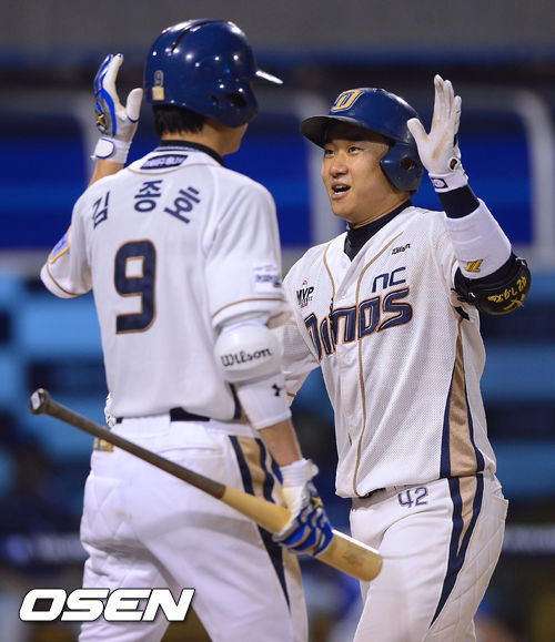 14일 오후 경남 창원시 마산구장에서 열린 2013 한국야쿠르트 세븐프로야구 NC 다이노스와 삼성 라이온즈의 경기 4회말 2사 2루 NC 김태군이 2점 홈런을 날리고 김종호와 하이파이브를 하고 있다