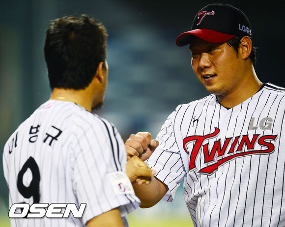 14일 오후 서울 잠실구장에서 열린 2013 한국야쿠르트 세븐프로야구 LG 트윈스와 넥센 히어로즈 경기, 6회를 마친 LG 선발 류제국과 이병규가 하이파이브를 하고 있다.