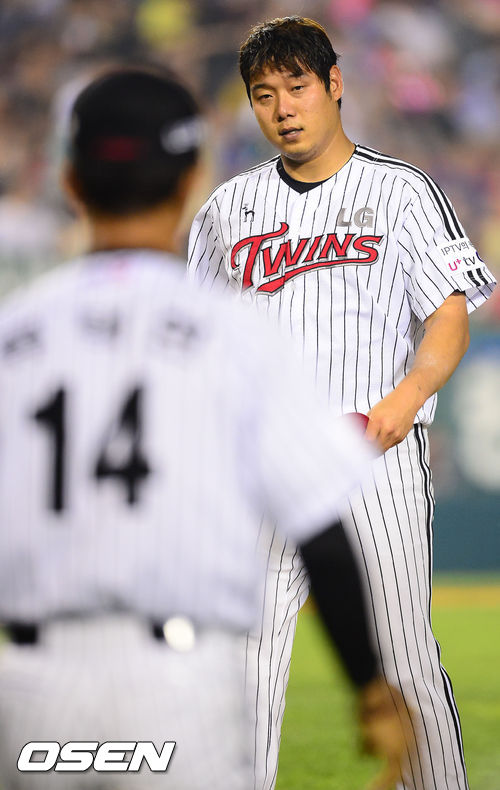 14일 오후 서울 잠실구장에서 열린 2013 한국야쿠르트 세븐프로야구 LG 트윈스와 넥센 히어로즈 경기, 7회초 1사 넥센 이성열 타석에서 LG 선발 류제국이 교체되며 류택현이 마운드에 오르고 있다.