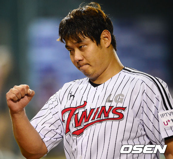 14일 오후 서울 잠실구장에서 열린 2013 한국야쿠르트 세븐프로야구 LG 트윈스와 넥센 히어로즈 경기, 7회초 1사 넥센 이성열 타석에서 LG 선발 류제국이 교체되며 주먹을 불끈 쥐고 있다.