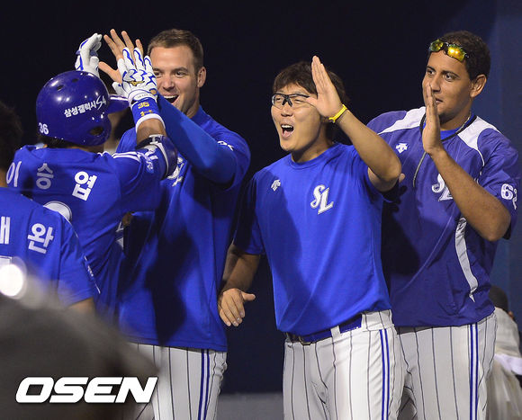14일 오후 경남 창원시 마산구장에서 열린 2013 한국야쿠르트 세븐프로야구 NC 다이노스와 삼성 라이온즈의 경기 5회초 1사 만루 삼성 이승엽이 역전 만루 홈런을 날리고 동료들의 축하를 받고 있다. 이승엽은 이날 홈런으로 개인통산 350호 홈런을 기록했다.