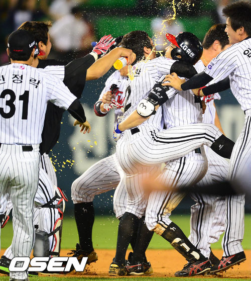 끝내기타를 날린 LG 문선재가 동료들과 기쁨을 나누고 있다./ rumi@osen.co.kr