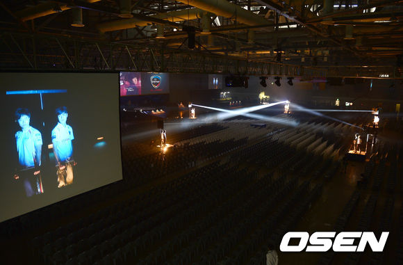 15일 오후 경기도 고양시 킨텍스 제2전시장에서 열리는 '롤챔스 스프링 2013' 결승전을 앞두고 양팀 선수들과 방송 관계자들이 리허설을 진행하고 있다.