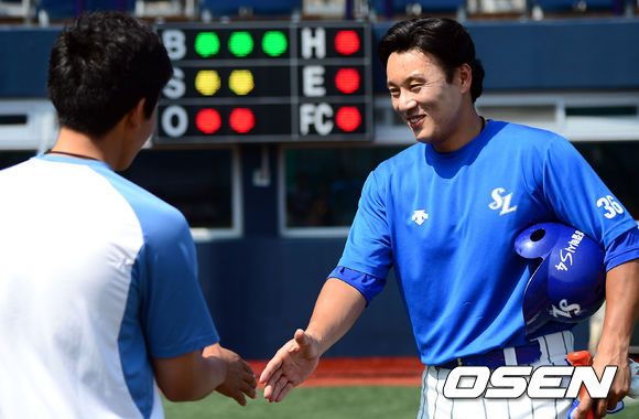 15일 오후 경남 창원시 마산구장에서 열리는 013 한국야쿠르트 세븐프로야구 NC 다이노스와 삼성 라이온즈의 경기전 삼성 이승엽이 NC 이상민과 인사를 나누고 있다.