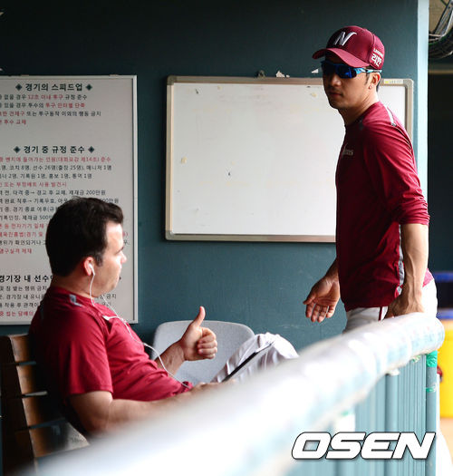 15일 오후 서울 잠실야구장에서 열리는 '2013 한국야쿠르트 세븐 프로야구' LG 트윈스와 넥센 히어로즈의 경기, 경기에 앞서 넥센 나이트와 이택근이 더그아웃에서 이야기를 나누고 있다.