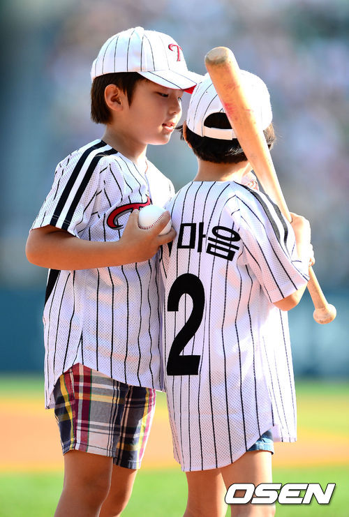 15일 오후 서울 잠실야구장에서 열린 '2013 한국야쿠르트 세븐 프로야구' LG 트윈스와 넥센 히어로즈의 경기, 경기에 앞서 배우 이정용의 아들 이믿음, 이마음 군이 시구 시타를 하며 이야기를 나누고 있다.